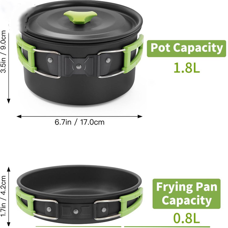 Angkop para sa iba't ibang mga mapagkukunan ng init kabilang ang mga kalan ng kampo, bukas na apoy, at portable grills. Ang mga kaldero at kawali ay hawakan ang lahat mula sa kumukulong tubig hanggang sa pagprito ng pagkain nang madali.