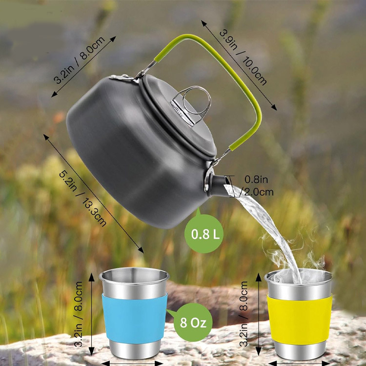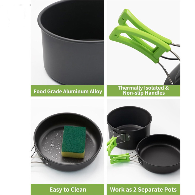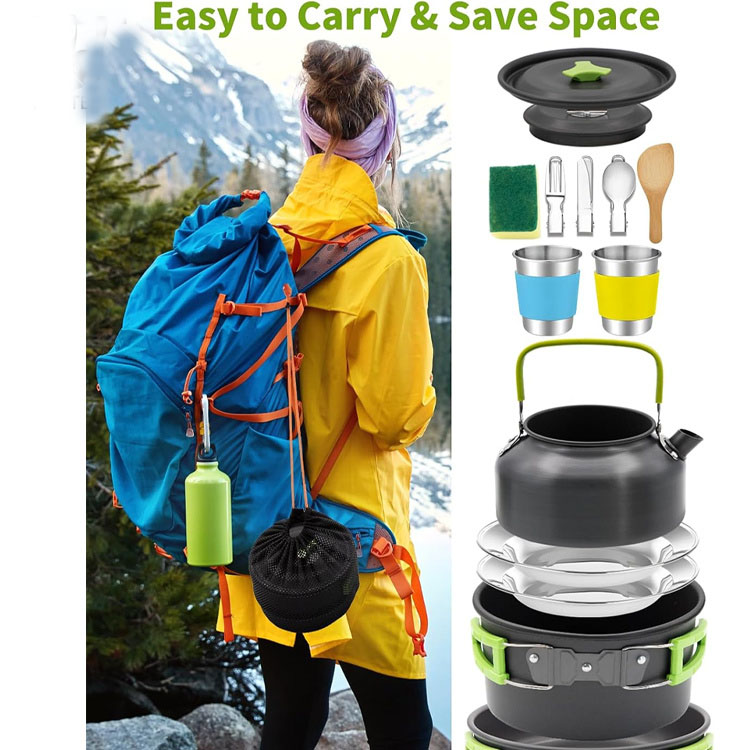 16pcs Camping Cookware, Camping Cooking Set Camping Pot. Kumpletuhin ang solusyon sa labas ng kusina. Ang 16-piraso camping cookware set na ito ay may kasamang mga kaldero, kawali, tasa, plato, at kagamitan. Dinisenyo para sa komprehensibong pagkain sa kamping, nagbibigay ito ng lahat ng kailangan para sa pagluluto at kainan sa ilang.
