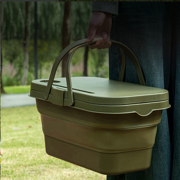 Basket Outdoor Camping Hiking Picnic Storage Container.Your Ultimate Portable Organization Solution Para sa Panlabas na Pakikipagsapalaran. Ang multifunctional foldable basket na ito ay pinagsasama ang isang lalagyan ng imbakan na may built-in na ibabaw ng talahanayan. Nilikha mula sa matibay na plastik, perpekto ito para sa kamping, paglalakad, at paglabas ng piknik.