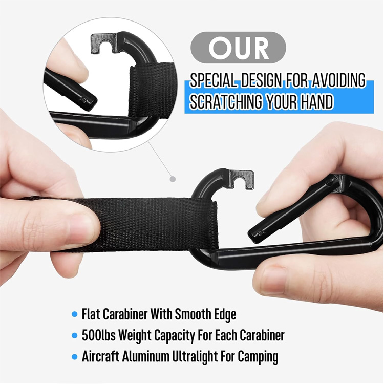 May kasamang dalawang 10-paa na nababagay na mga strap ng puno na may 15+ mga puntos ng loop at mga carabiner ng aluminyo na may aluminyo, na nagpapagana ng ligtas na pag-install sa mga puno na 12 hanggang 25 talampakan ang pagitan nang hindi nakakasira ng bark.