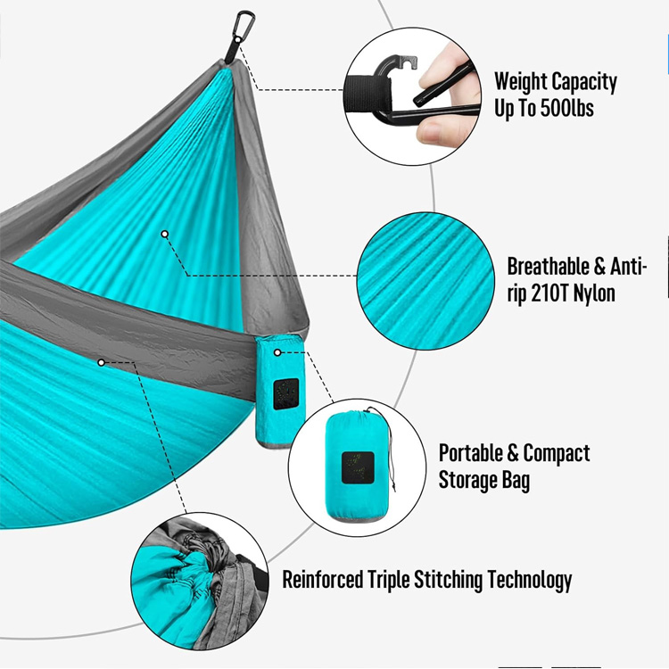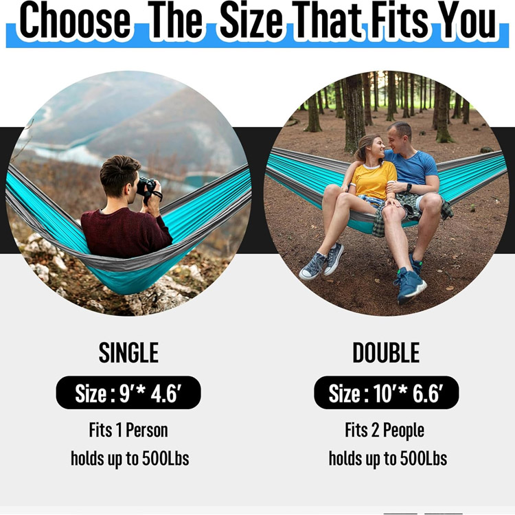 Camping Hammock Double & Single Portable Hammock.Your Ultimate Versatile Relaxation System para sa Panlabas na Adventures. Ang camping hammock na ito ay tumatanggap ng parehong doble at solong mga gumagamit na may adaptive na disenyo nito. Kumpletuhin sa mga propesyonal na strap ng puno, ang magaan na naylon parachute hammock na ito ay naghahatid ng maximum na kaginhawaan at kakayahang magamit.
