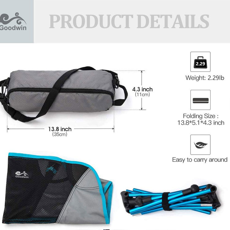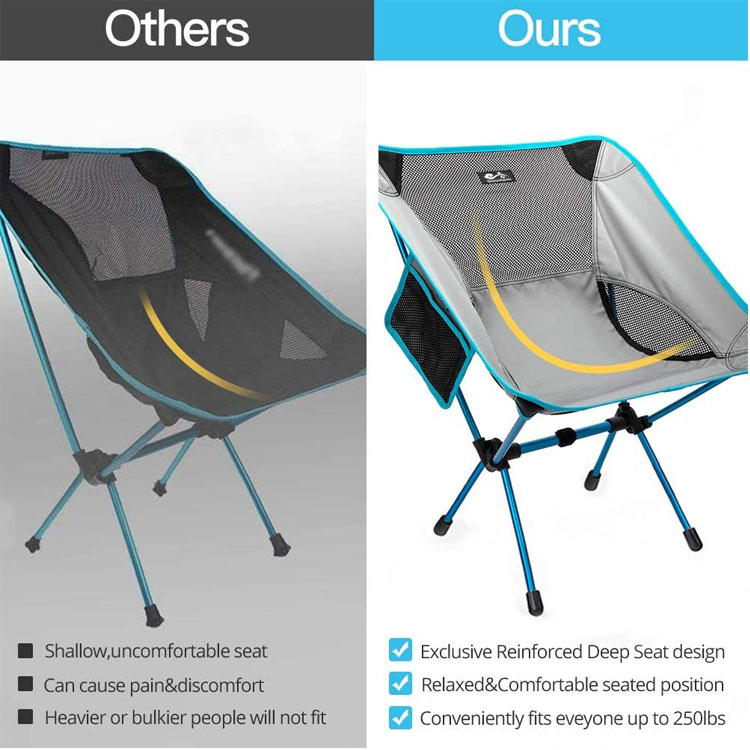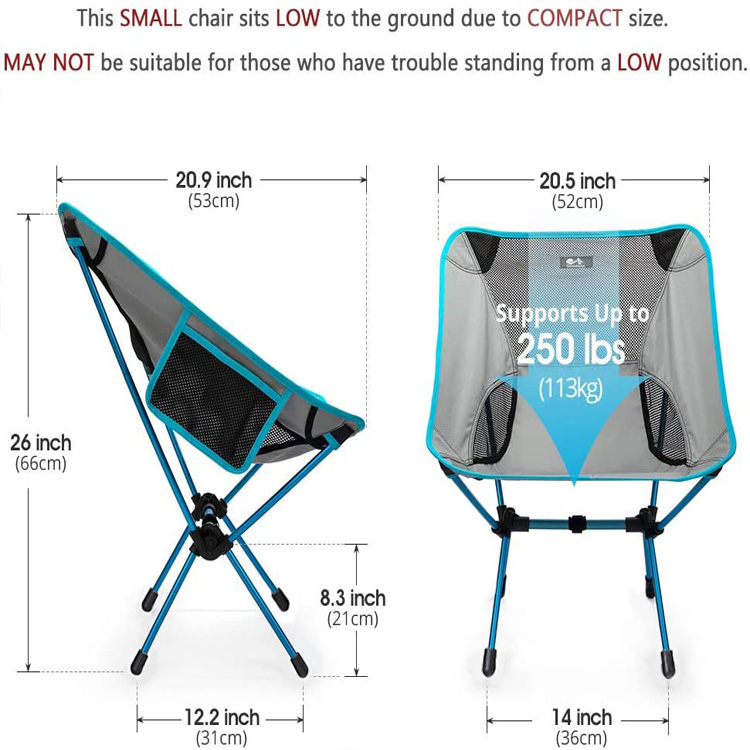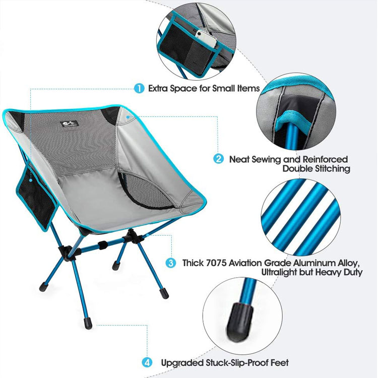 Ultra-lightweight portable compact na natitiklop na camping chair. Compact at madaling dalhin gamit ang madaling gamiting bag, ito’S perpekto para sa mga biyahe sa beach, kamping, backpacking, hiking, o anumang panlabas na pakikipagsapalaran kung saan ang kaginhawaan ay nakakatugon sa kaginhawaan.
