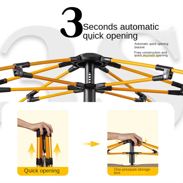 Mataas na kalidad na 2, 4, 6-person na hindi tinatagusan ng tubig na awtomatikong panlabas na tolda.Experience Hirap na walang kampo sa kamping kasama ang aming de-kalidad na awtomatikong tolda. Dinisenyo para sa 2, 4, o 6 na tao, nagtatampok ito ng mahusay na dobleng makapal na tela ng Oxford para sa mahusay na hindi tinatagusan ng tubig at hindi tinatagusan ng hangin na proteksyon. Ang iyong maaasahang kanlungan para sa all-weather panlabas na pakikipagsapalaran.