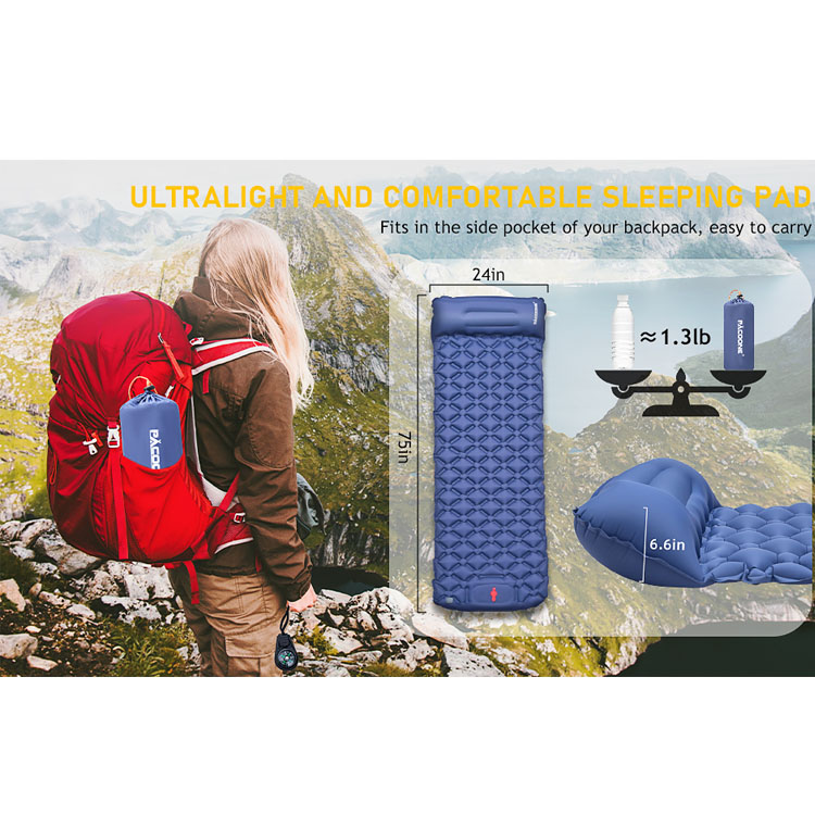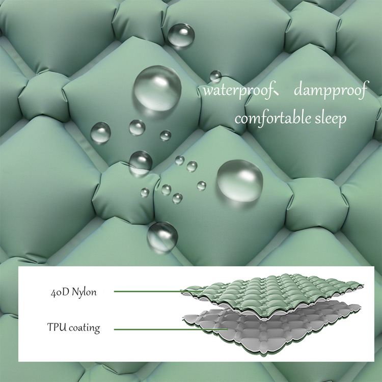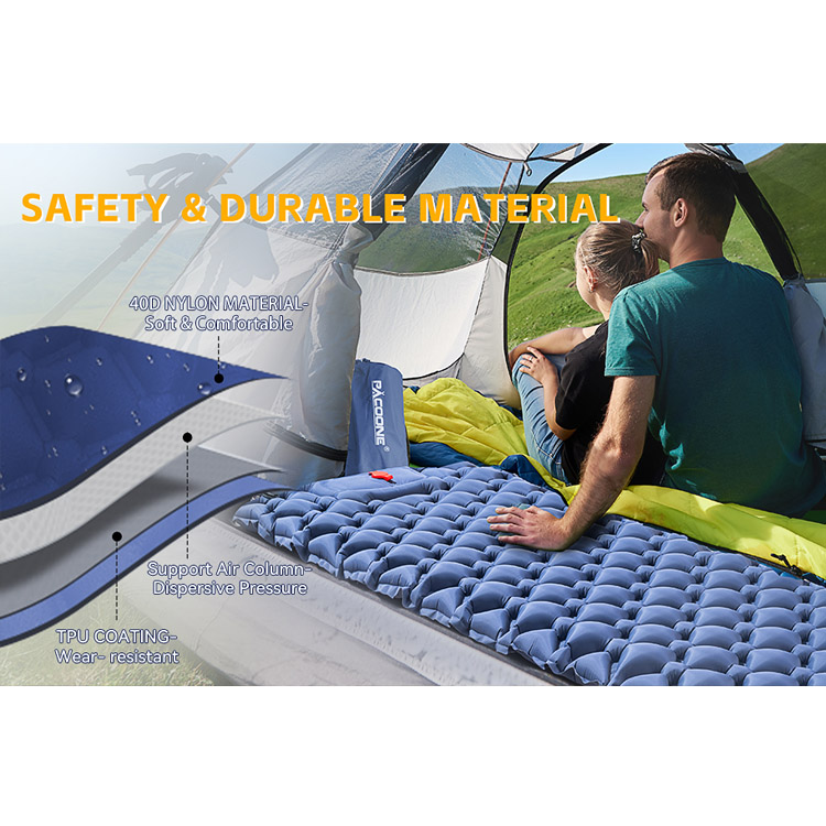 Magaan na Nylon Material Folding Camping Tent Sleeping Pad.Your Ultimate Portable Sleep Solution Para sa Panlabas na Adventures. Ang ultralight inflatable kutson ay nagtatampok ng single-press inflation at integrated na disenyo ng unan. Nilikha mula sa matibay na materyal na naylon, nagbibigay ito ng higit na kaginhawaan para sa pag -hiking at kamping, tinitiyak ang matahimik na gabi kahit saan.
