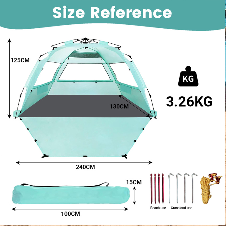 Pakyawan bulk ultralight polyester sun shade beach tent.your premier wholesale solution para sa proteksyon sa araw ng beach. Ang ultralight polyester sun shade tent ay nagtatampok ng isang maginhawang pop-up na nakatiklop na disenyo. Perpekto para sa bulk na panlabas na paggamit ng beach, pinagsasama nito ang madaling pag -deploy na may maaasahang saklaw ng lilim.